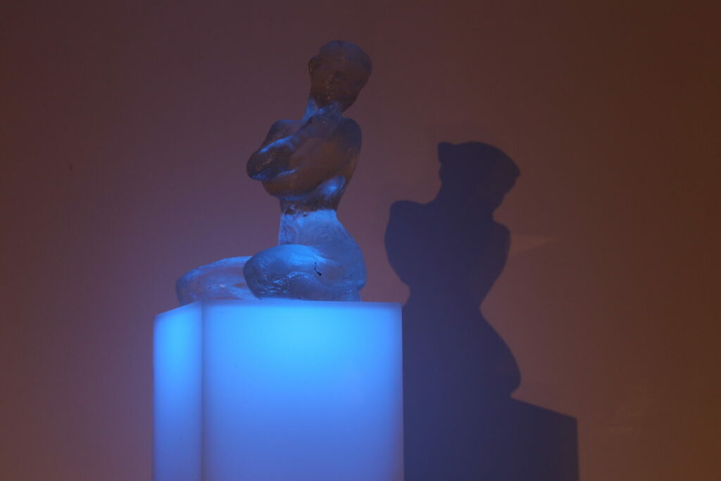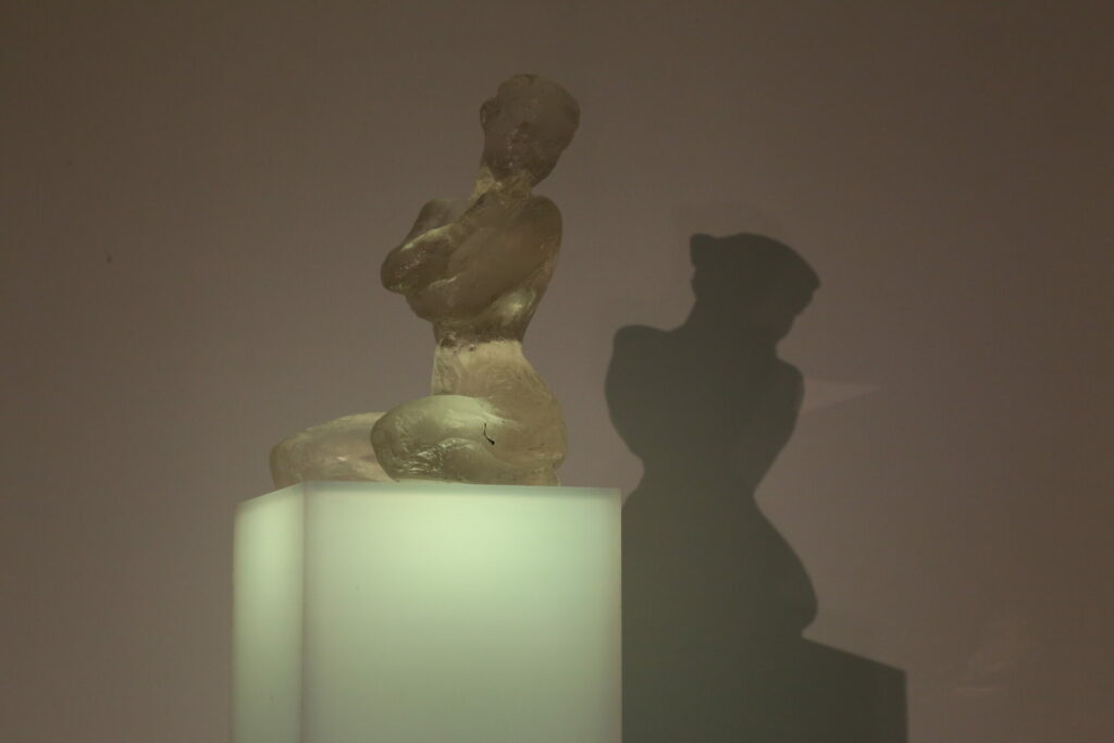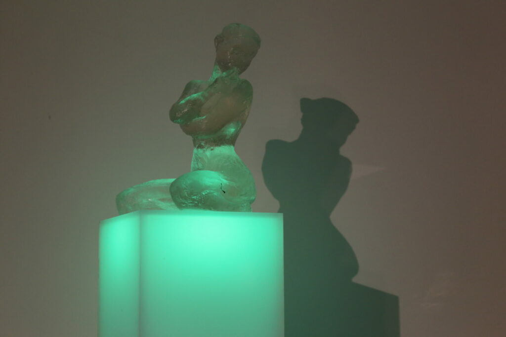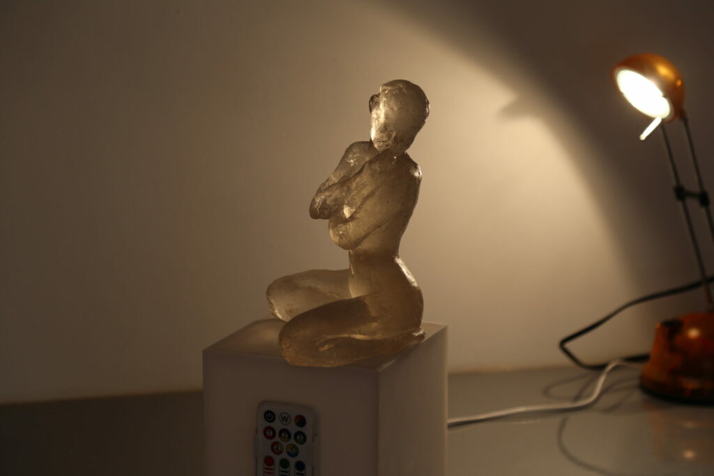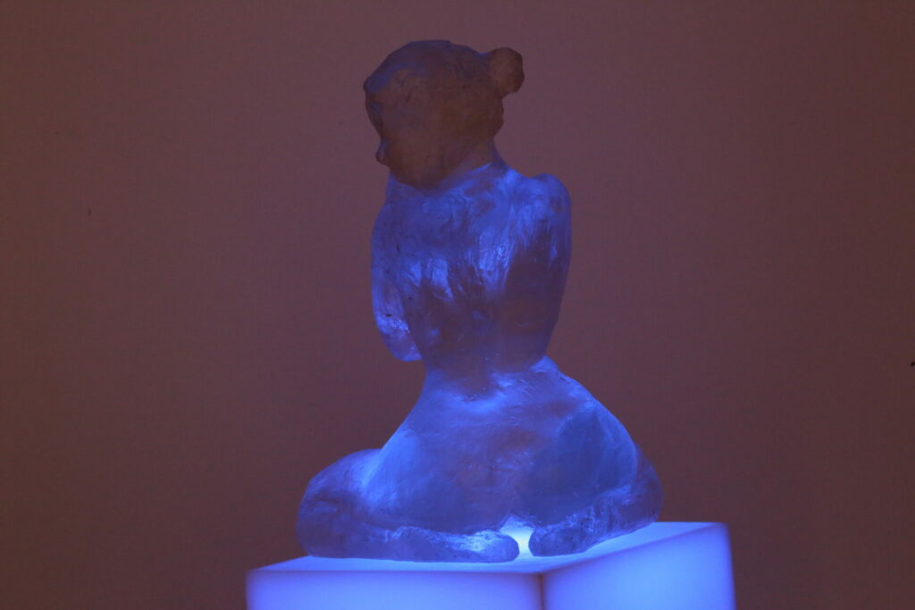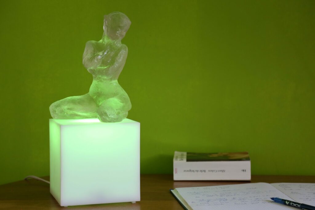 Alessia pensive, fruit d’une rencontre avec une étudiante italienne, est déclinée ici en version résine polyester cristal (elle existe aussi en bronze). Alessia est posée sur un cube lumineux réalisé à la main en plexiglas par l’artiste, elle est ainsi éclairée de l’intérieur..