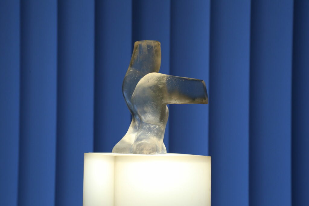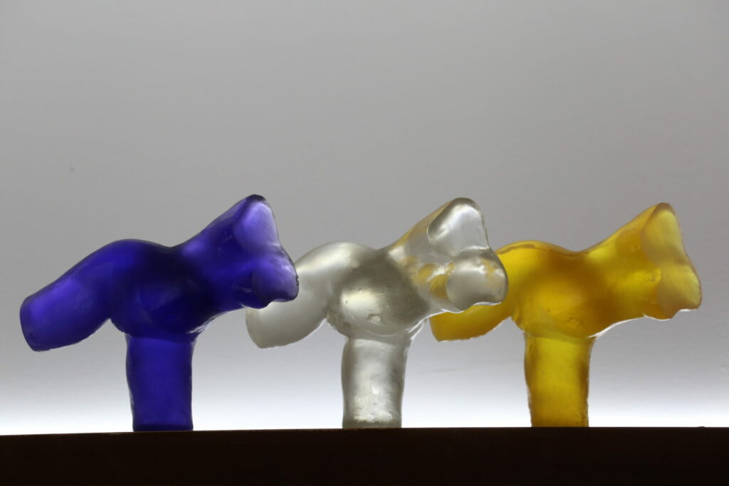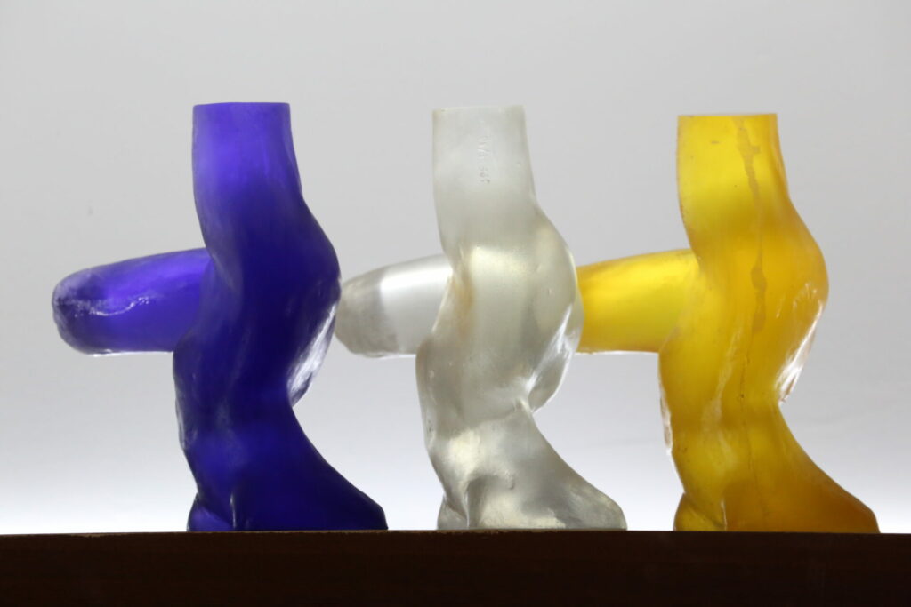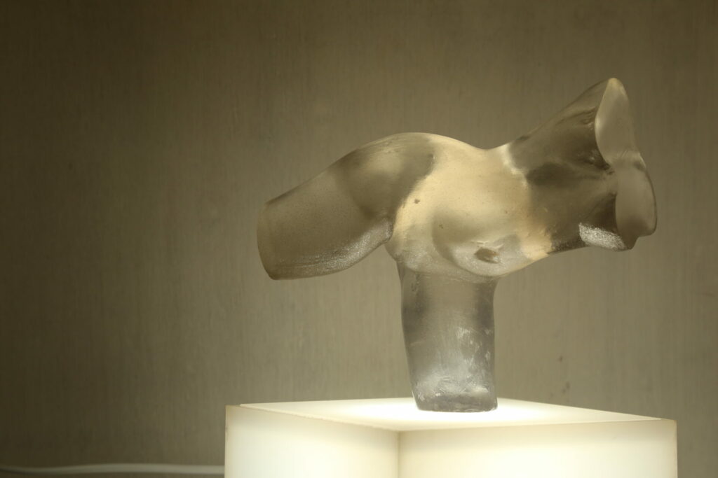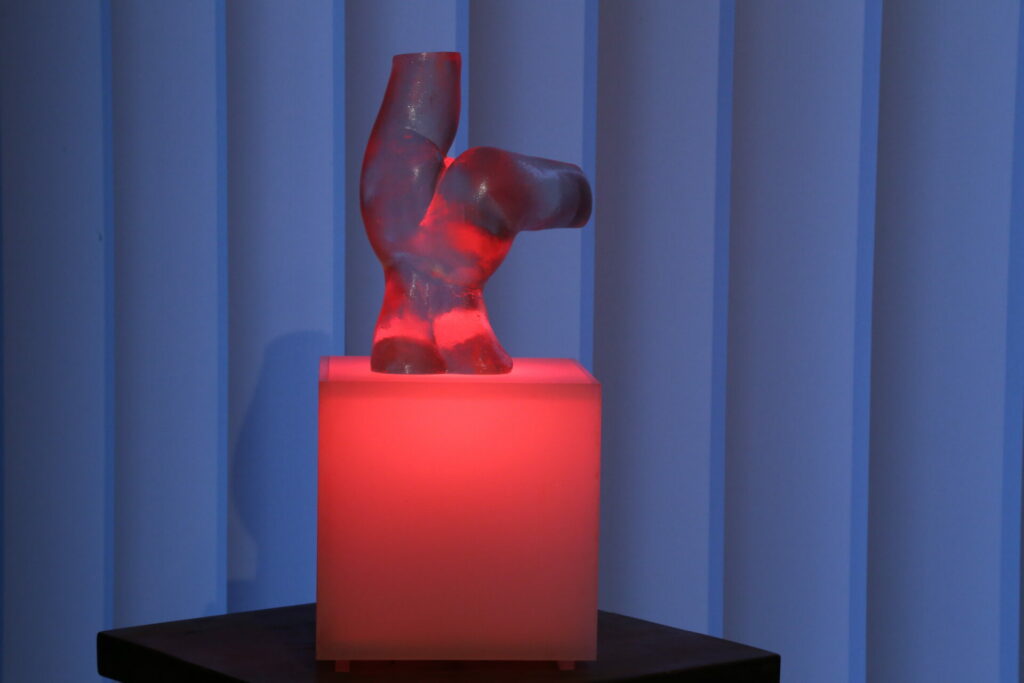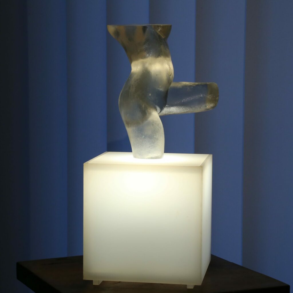 Polymorphe car la sculpture en résine transparente peut se placer sur le cube dans 5 positions différentes.