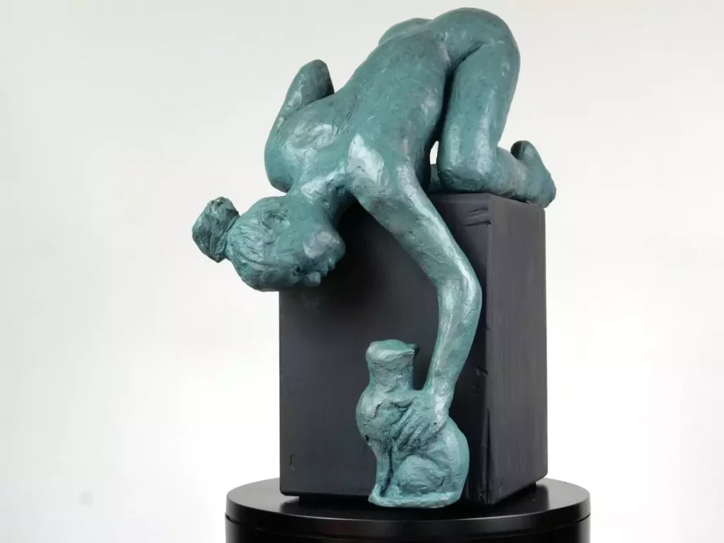 La jeune femme et le chat 2024Plâtre, patine, acier, bois – H 40 cm x L 25 cm x P 21 cm